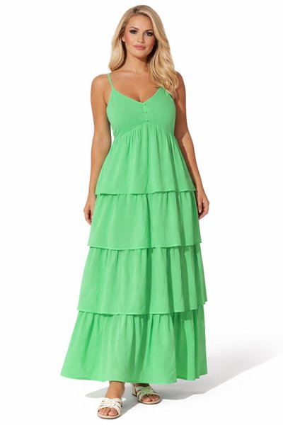 Lång klänning i en ljusgrön nyans med tunna axelband och V-ringning. Klänningen har en smickrande passform med en markerad midja och en utsvängd kjol med flera volanger som ger en fin volym. Perfekt för varma dagar eller sommarfester.