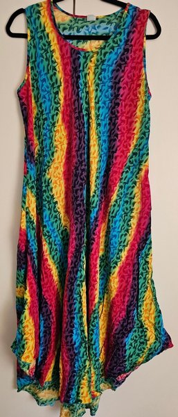 Färgglad klänning med ett unikt mönster i regnbågens alla färger. Klänningen är ärmlös och har en rund halsringning. Den har en asymmetrisk fåll.