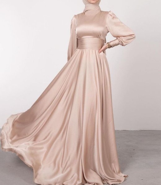 Elegant, hellång klänning med långa ärmar och hög hals. Klänningen har en markerad midja.