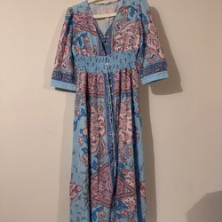 Langærmet kjole i pink nuancer med brune detaljer. Kjolen har knapper hele vejen ned foran og et let, luftigt udtryk.