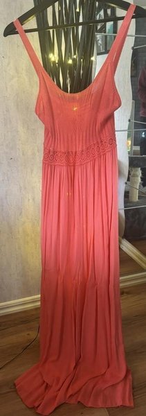 Lång klänning i en vacker korallrosa nyans. Klänningen har smala axelband och en elegant urringning. Överdelen har en finstickad eller virkad struktur med ett dekorativt band i midjan/övre höften med cirkulära mönster. Kjoldelen är vid och faller vackert med veckade eller vågiga detaljer, vilket ger en luftig och flödande silhuett. Storlek:40-42.