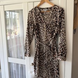 Röd omlottklänning med vita prickar. Klänningen har korta ärmar med knytdetaljer och ett knytband i midjan. Klänningen är längre baktill och kortare framtill.