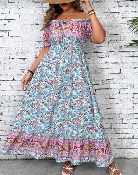 Maxiklänning med blommigt mönster i ljusa färger. Klänningen har en off-shoulder-design med korta ärmar och en smockad midja som ger en fin silhuett. Kjolen är vid och faller i ett flödande tyg med en volangdetalj nedtill.