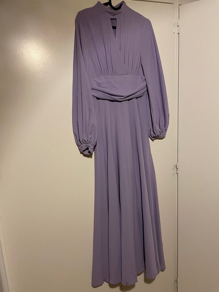 Långklänning i lila nyans med långa ärmar. Klänningen har en hög krage med en liten nyckelhålsdetalj framtill. Midjan är markerad med en draperad detalj som ger en smickrande silhuett. Ärmarna avslutas med manschetter.