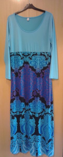 Klänning med långa ärmar och rund halsringning. Överdelen är enfärgad i turkosblått, medan kjoldelen har ett mönster i blått, lila och svart. Stretchigt tyg.