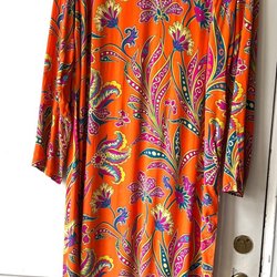 Färgglad klänning med ett abstrakt ansikte tryckt över hela klänningen. Klänningen har korta ärmar och en V-ringning. Storlek xl, passar 42-44, helt ny och oanvänd.