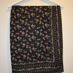 Röd klänning med ett blommigt mönster i vitt och svart. Klänningen har smala axelband med volangdetaljer och en smockad överdel. Knappt använd
