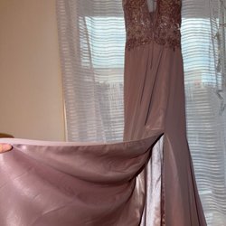 En långklänning med guldfärgade paljettdetaljer runt halsringningen och midjan. Klänningen har en v-ringad omlottdesign upptill och en dold dragkedja i sidan. Ryggen har en nyckelhålsöppning med knappstängning i nacken.