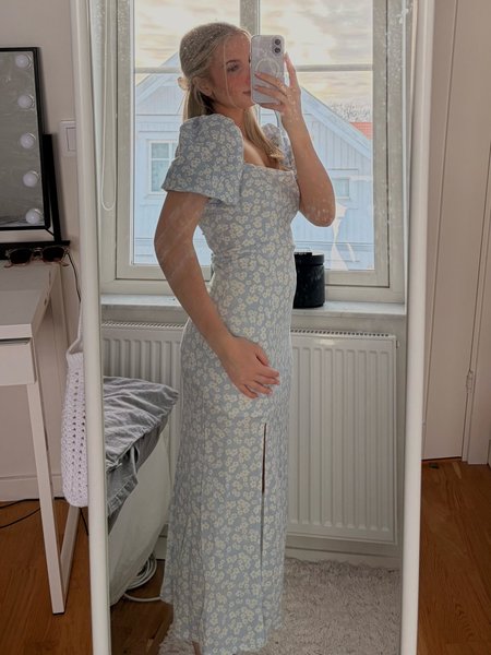 En ljusblå klänning med vita blommor. Klänningen har puffärmar och en fyrkantig halsringning. Den är figurnära med en slits framtill.