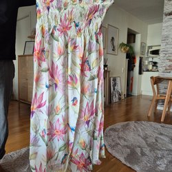 Lång klänning med mönster i flera färger. Klänningen har smala flätade axelband och en resår i midjan. Överdelen har en snörning framtill med dekorativa tofsar och lövformade detaljer.
