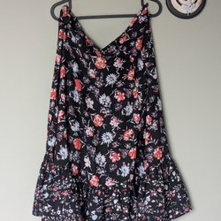 Grön klänning med vita blommönster. Klänningen har tunna axelband som korsas i ryggen. Bysten är formad med en smickrande passform och kjolen faller löst från midjan. Klänningen är lång och har en avslappnad silhuett.