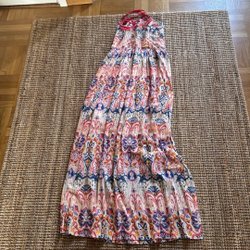 Klänning med omlottdesign och plisserad kjol. Klänningen har långa ärmar med volangdetaljer vid ärmsluten. Midjan markeras med ett knytband.