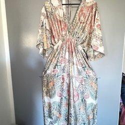 Klänning med blommigt mönster. Klänningen har volanger vid ärmarna och en knytband i midjan.