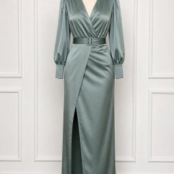 Elegant långklänning med djup V-ringning och öppen rygg. Klänningen har en smickrande passform som framhäver silhuetten och är perfekt för festliga tillfällen.