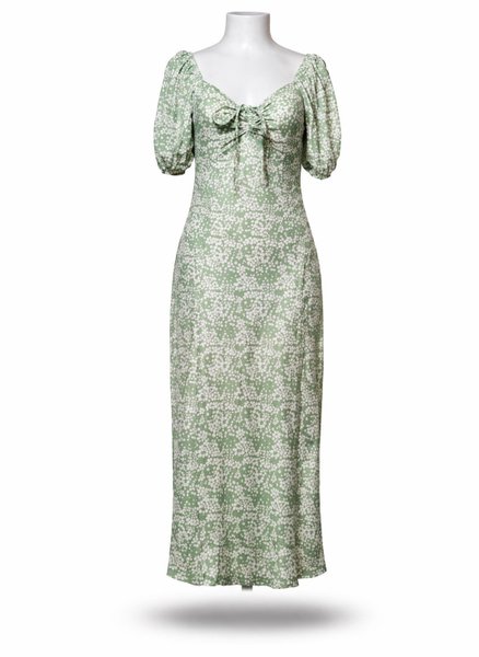 Klänning med puffärmar och knytning framtill. Klänningen har en smickrande passform och ett blommigt mönster över hela plagget.