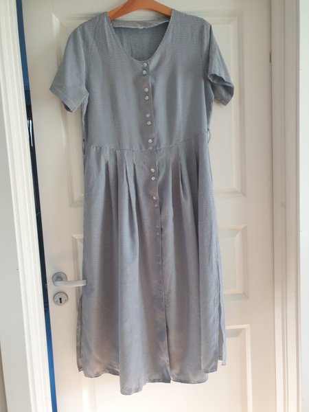 Klänning med korta ärmar och V-ringning. Klänningen har knappar framtill från halsen ner till midjan och en plisserad kjol. Enkel och stilren design som passar för många tillfällen.