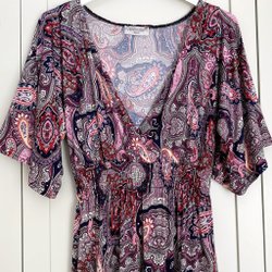 Maxiklänning med v-ringning och korta ärmar med volang. Klänningen har ett blommigt mönster i färgerna orange, rosa, blått och vitt mot en mörkblå bakgrund. Den har en dragsko i midjan.