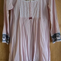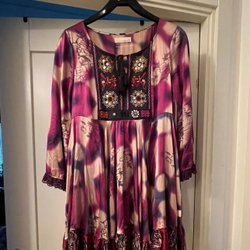 Grå/brun klänning med broderade blommor i olika färger. Klänningen har v-ringning och smala axelband. Den har en knytdetalj i ryggen och en volang nedtill.