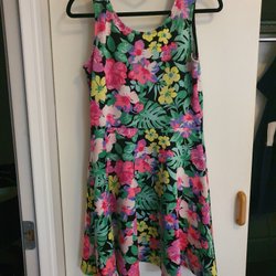 Klänning med blommigt mönster i rosa, blått och svart. Den har korta ärmar och en dekorativ detalj med en öppning och knytning i ryggen.
