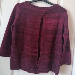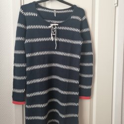 Finstickad klänning med lång ärm och randigt mönster i färgerna marinblå, beige, vit, rosa och röd.
