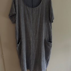Blå klänning med ett blommigt mönster i vitt. Klänningen har korta ärmar och en rund halsringning. Den har veck framtill. Mått längd 106 cm 48 cm mellan ärmhålen. Mjuk och lät. Material Jersey blandning och mycket stretchig. Fickor i sidan.