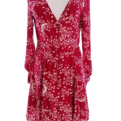 Denna vackra vinröda klänning från Paradis London i storlek 10 (38) är definitivt en showstopper. Med dess knälånga A-linje siluett och ärmlösa design kommer du att sticka ut i varje sammanhang. Rosetten på klänningen ger en extra touch av elegans och charm som gör att du känner dig som en riktig stjärna.Tidlös och mångsidig