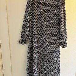 Elegant svart klänning med ett unikt tryck i vitt och svart längs framsidan. Klänningen har en hög krage och knäpps med knappar. De vida ärmarna i tunt tyg ger en sofistikerad touch.