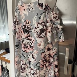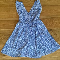 Blå klänning med vita prickar och blommor. Klänningen har en vit krage och guldiga knappar. Den har korta ärmar och ett skärp midjan.