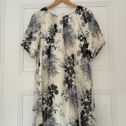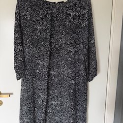 Elegant, långärmad klänning med ett unikt svartvitt blommönster. Klänningen har en klassisk krage och knäpps framtill. En matchande knytskärp framhäver midjan och ger en smickrande silhuett.