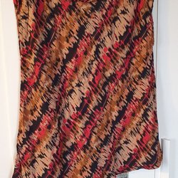 Ärmlös klänning med ett blommigt mönster i olika nyanser av brunt, rosa, orange och vitt. Klänningen har en rund halsringning och en avslappnad passform.