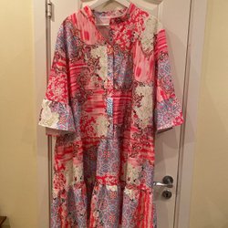 Rosa klänning med ett blommigt mönster i olika nyanser av rosa, vitt, blått och svart. Klänningen har en v-ringning med knappar och långa ärmar med volanger. Den har en avslappnad passform och en volangkjol.