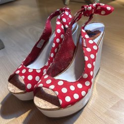 Röd klänning med vita prickar, puffärmar och en markerad midja. Klänningen har en utsvängd kjol och fickor.