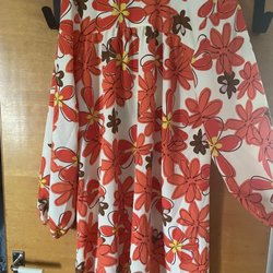 Brun mönstrad klänning med långa ärmar och knappar framtill. Klänningen har en skjortkrage