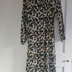 Fint mönstrad klänning med resår i midjan och svart kant runt halsen. Klänningen har ett unikt tryck med olika mönster i rutor.