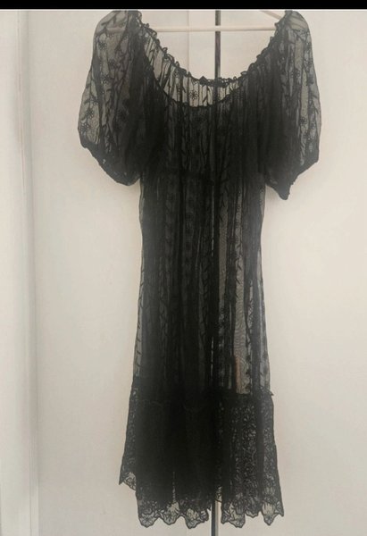 Svart, genomskinlig klänning med spetsdetaljer och puffärmar. Klänningen har en off-shoulder design.