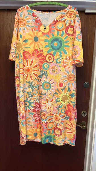 Färgglad klänning med ett blommigt mönster i olika nyanser av gult, orange, rött, grönt och blått. Klänningen har en v-ringning och korta ärmar.