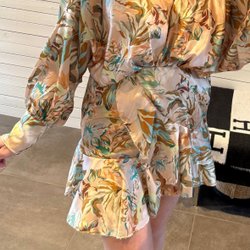 Klänning med blommigt mönster och guldiga detaljer runt halsen.