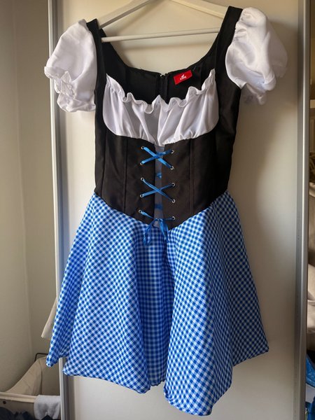 Klänning i tyrolerstil med en svart livstyckesdel som snörs med blått band. Den har en vit blus med puffärm och en blå-vit rutig kjol. Perfekt för oktoberfest eller andra temafester.