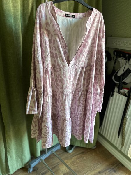 Klänning med v-ringning och långa ärmar. Klänningen har ett rosa leopardmönster och en avslappnad passform med volanger.