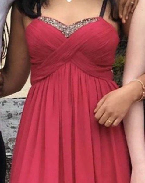 Elegant klänning med strassdetaljer vid bysten och korsad design över bröstet. Klänningen har en utställd kjol.