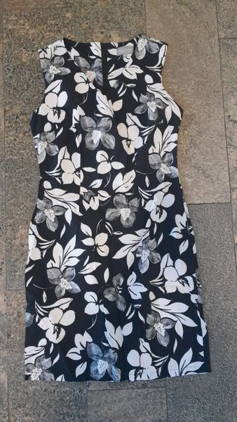 Svart klänning med ett blommigt mönster i vitt och grått. Klänningen är ärmlös och har en figurnära passform.