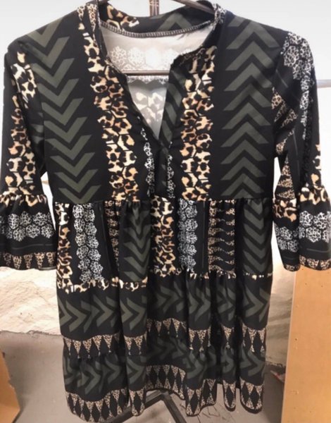 Klänning med ett unikt mönster i olika nyanser. Den har en v-ringning och trekvartsärmar med volangdetaljer. Klänningen är i en utsvängd modell med flera sektioner.strl M