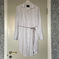 Mått: armhålor 50 cm, höfter 54 cm, längd fram 80 cm, bak 95 cm. Långa ärmar med knapp i manschett.