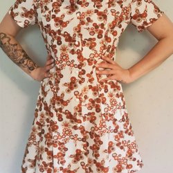 Färgglad klänning med blommigt mönster i olika färger som rött, rosa, grönt och vitt.