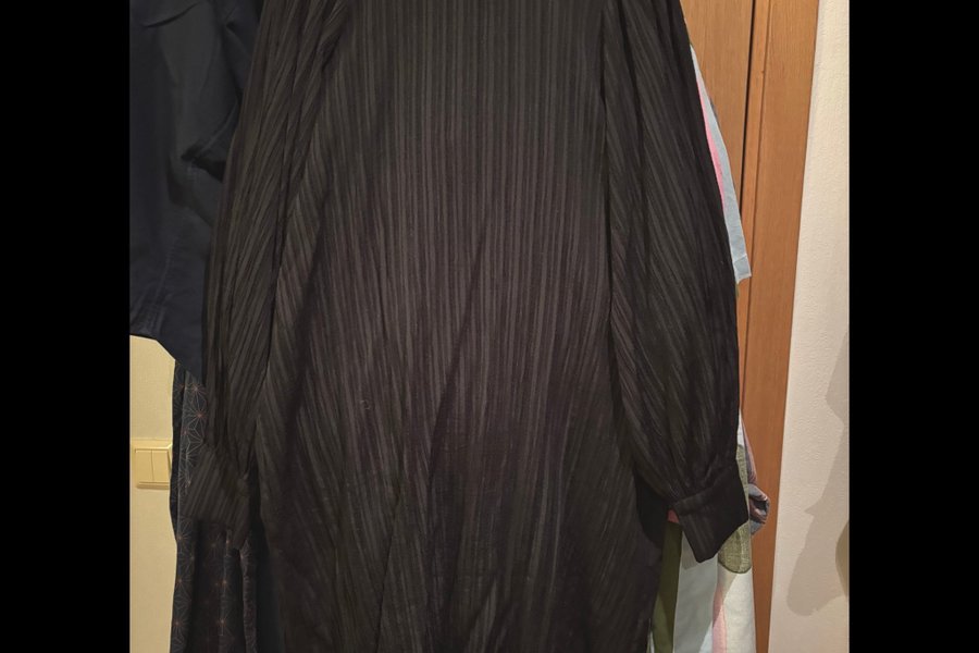 Svart klänning med långa, vida ärmar och en rak passform. Klänningen har en subtil, texturerad yta med vertikala linjer som ger ett elegant intryck. Märke: Fransa. OBS saknas ett tygskärp.
