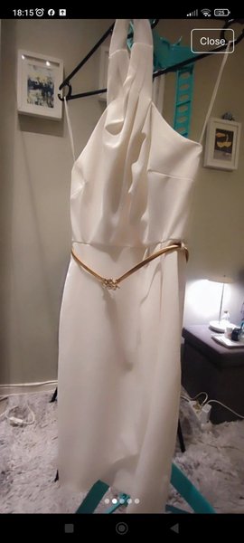 Elegant vit klänning med halterneck-design och en smal guldfärgad kedja i midjan. Klänningen har en figurnära passform upptill och faller sedan mjukt. Perfekt för festliga tillfällen eller sommarfester.
