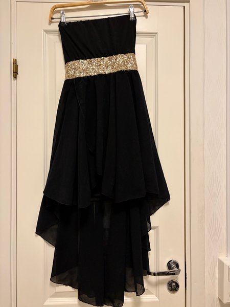 Svart klänning med en glittrig guldfärgad midja. Klänningen är axelbandslös och har en ”high-low”-skärning där den är kortare fram och längre bak.