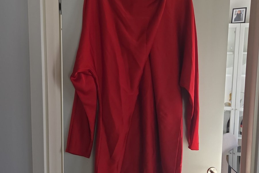 Röd klänning med långa ärmar och en draperad hög krage. Klänningen har en lös passform och knäppning med knappar i nacken.