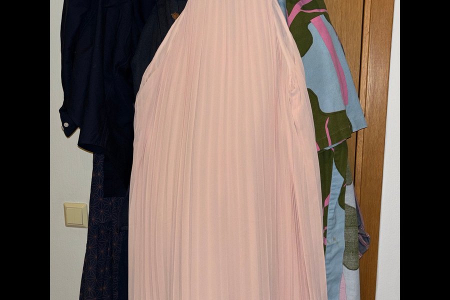 Ljusrosa klänning med plissédetaljer och halterneck. Aldrig använd!