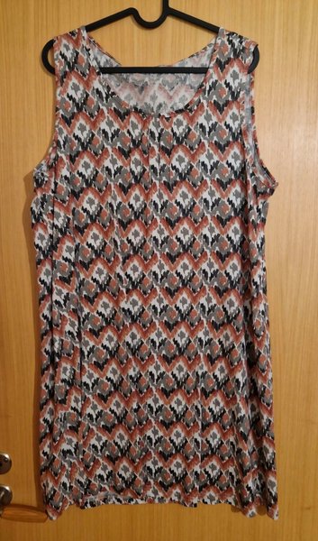 Ärmlös klänning med ett mönster i nyanser av vitt, brunt, grått och svart. Klänningen har en rund halsringning med en liten öppning framtill.